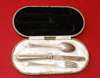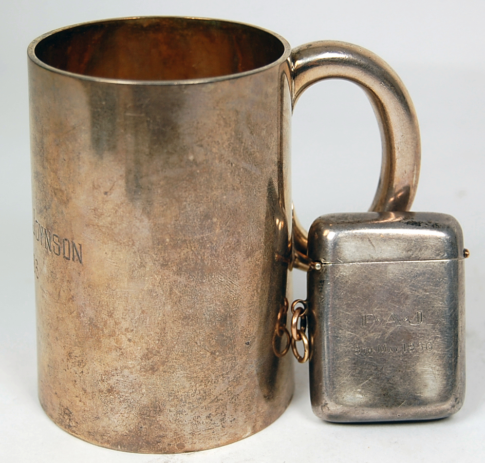 to include a cased christening set, comprising knife, fork and spoon; a glass bottomed tankard; a two piece eastern belt buckle; a Continental heart shaped box with crown finial; a vesta case etc (qty)