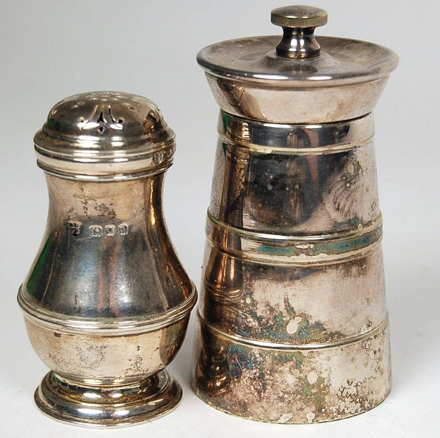 retailed by Tessiers, London 1930, of simple baluster form with reeded girdle, the pull off domed covers with simple pierced designs; together with four silver plated capstan pepper grinders (8)