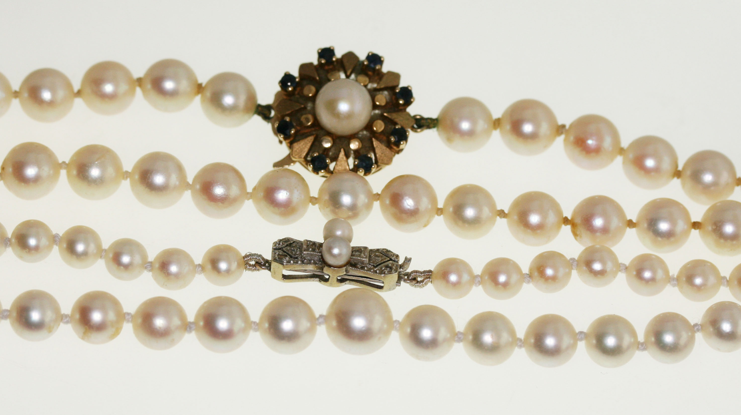 a single strand with a small diamond and pearl set clasp, 52cm long and another of even size beads, 9ct yellow gold clasp set sapphires and a pearl, 80cm long (2)