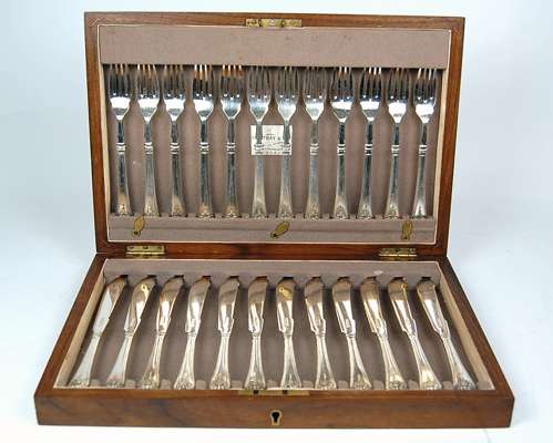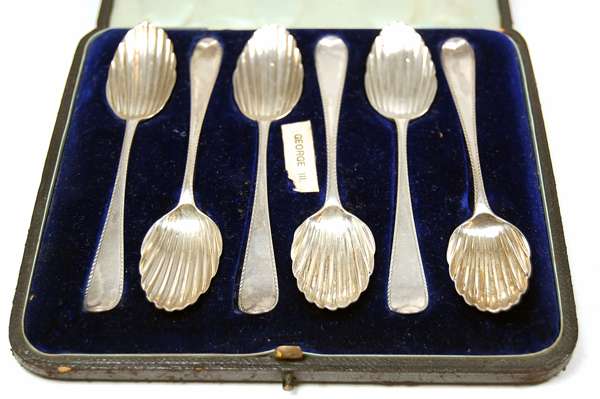 to include a set of six George III teaspoons with feathered edge and fluted bowls; cased teaspoons grapefruit spoons tea knives etc (qty)