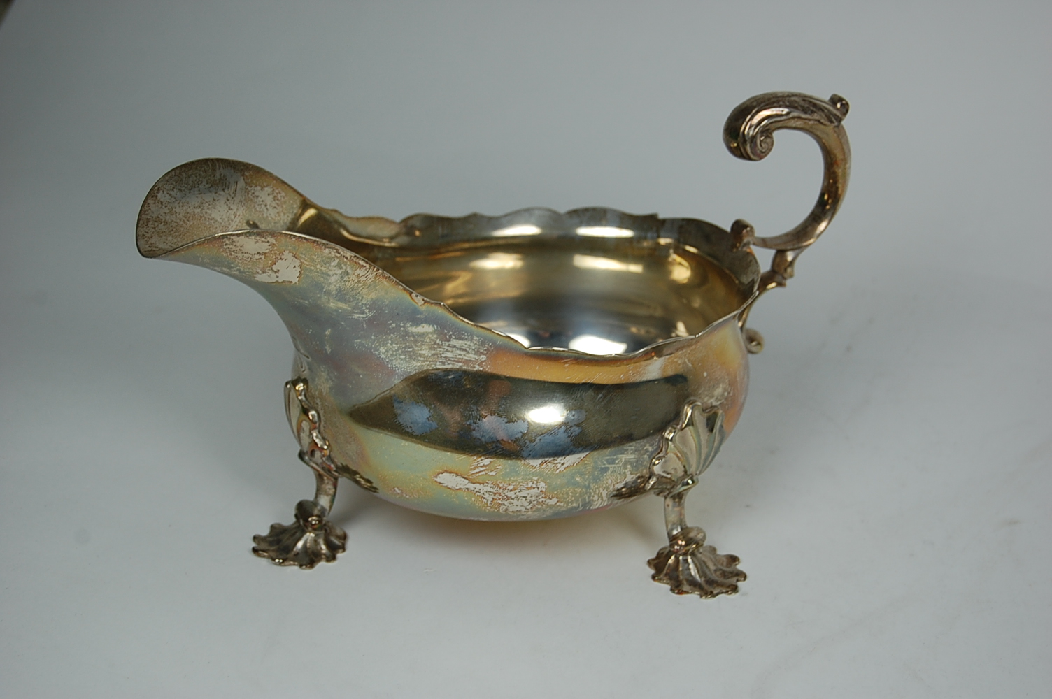 IW / WM, London 1836, of conventional form with simple baluster body with everted scalloped rim and wide spout, simple leaf capped S scroll handle and raised on three shell terminaled feet
