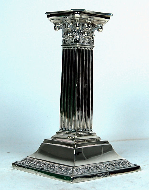 A pair of Corinthian dwarf silver candlesticks