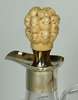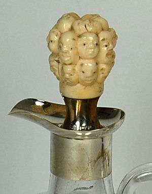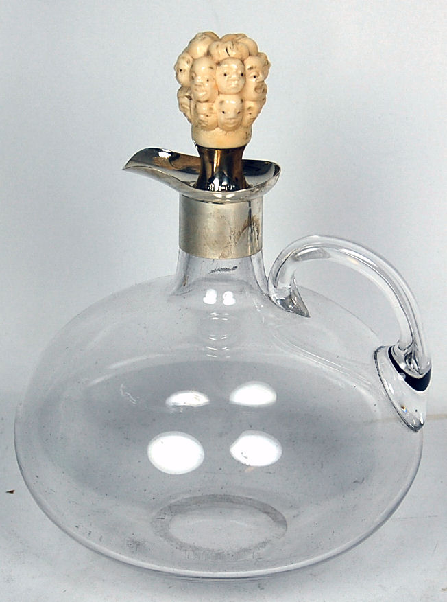 J G Betjemann & E E Betjemann, London 1899, the bulbous glass body with simple collar mount and spout, the pull out stopper with silver collar and mounted with a novelty ivory stopper carved with numerous heads, with two character signature mark