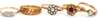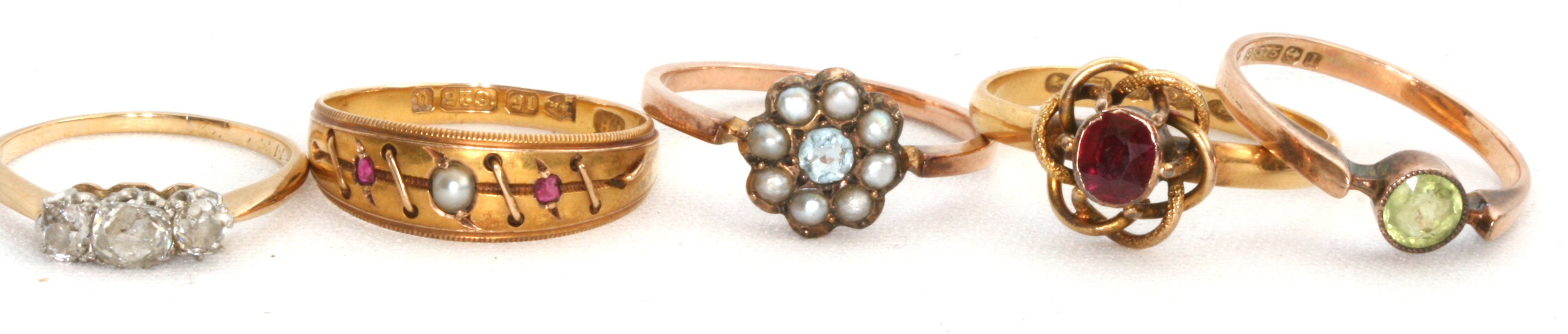 to include; a pearl and aquamarine cluster; a pearl and ruby set ring; one set garnet; another peridot and a three stone diamond ring (5)