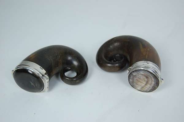 mounts unmarked, each of conventional curly horn type with hinged horn covers, one set to body with shield shaped cartouche with engraved initials JA / 1803 (2)