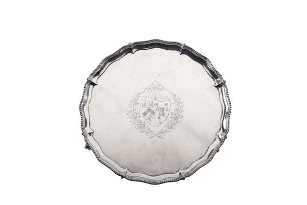 Richard Rugg, London 1773, of shaped circular outline with wavy edge with beaded and foliate detail to points, the centre engraved with coat of arms within foliate cartouche, the whole raised on three ball and claw feet