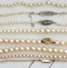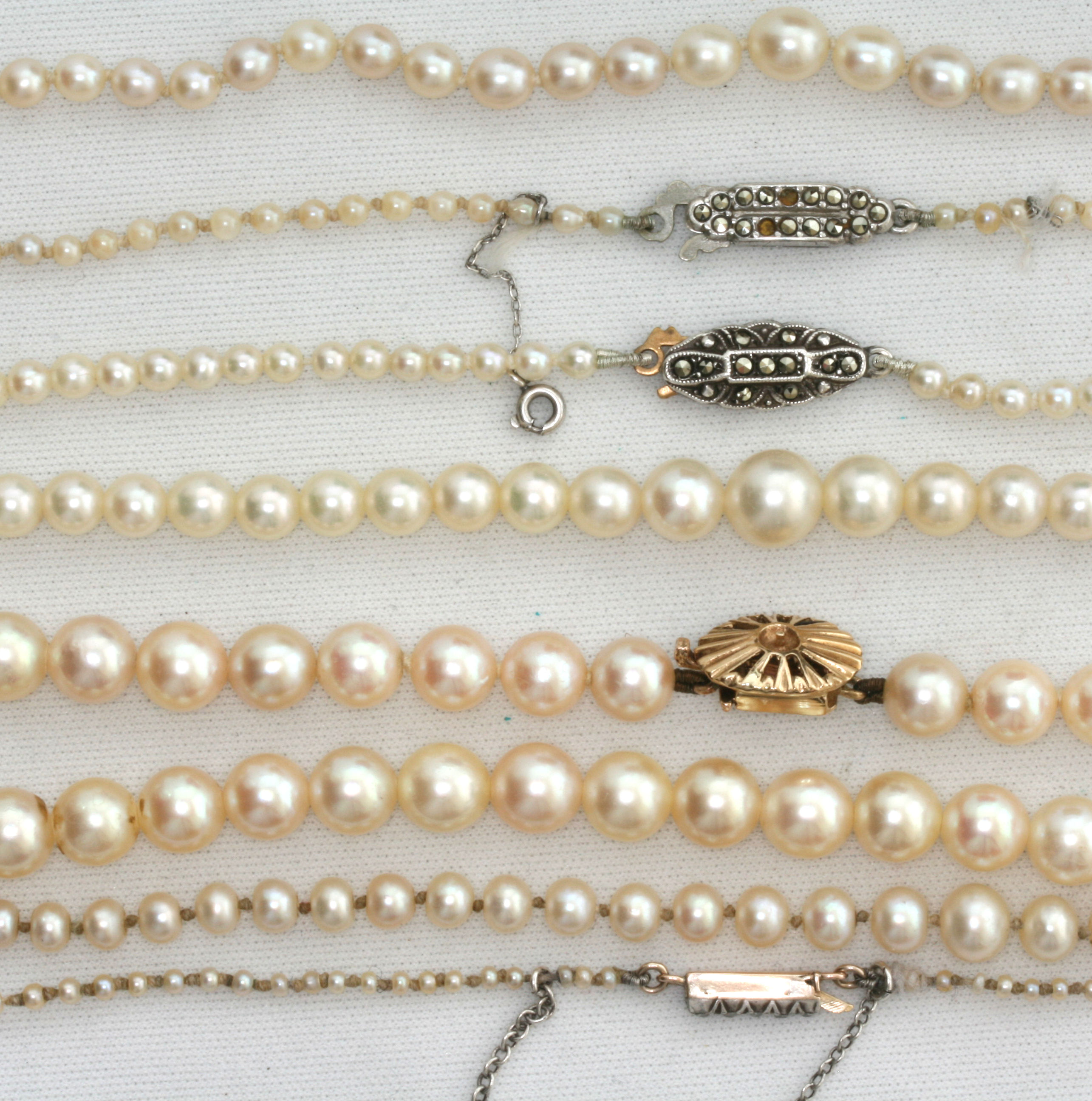 to include a graduated pearl necklace with slim rectangular clasp set with single cut diamonds; a uniform pearl necklace, with ribbed oval clasp; together with two graduated pearl necklaces, each with marcasite set clasp (pearls untested) (4)