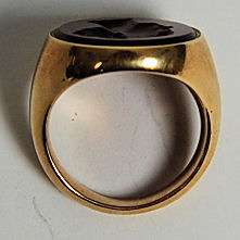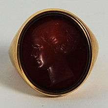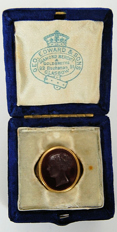 incised with a finely carved female portrait profile, reputed to be a member of the Dundas family, to a plain tapering setting, contained in a blue velvet fitted case stamped GEO. EDWARD & SONS GLASGOW...
