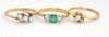 to include; a small three stone diamond ring; a diamond and pearl set ring; an emerald and diamond ring in millegrain setting