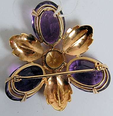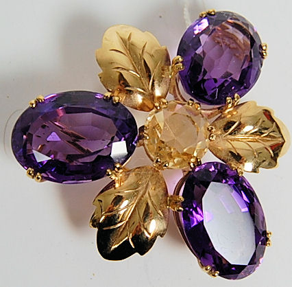 designed as a floral cluster, claw set to the centre with a circular cut citrine, within a surround similarly set with three large oval cut amethysts, interspersed by foliate motifs
