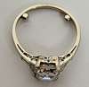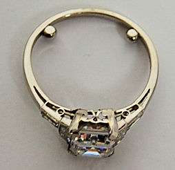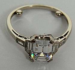 the central corner claw set trap cut colourless gem flanked to either shoulder by a tapering baguette cut diamond and a smaller baguette cut diamond