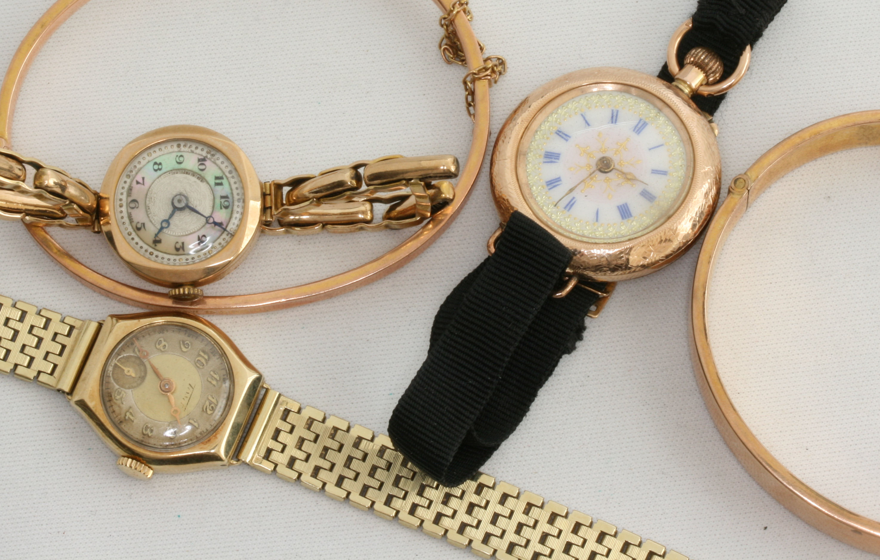 to include a 15ct gold wrist watch and bracelet; a 15ct gold fob watch; a 9ct gold wrist watch; two hinged bangles