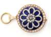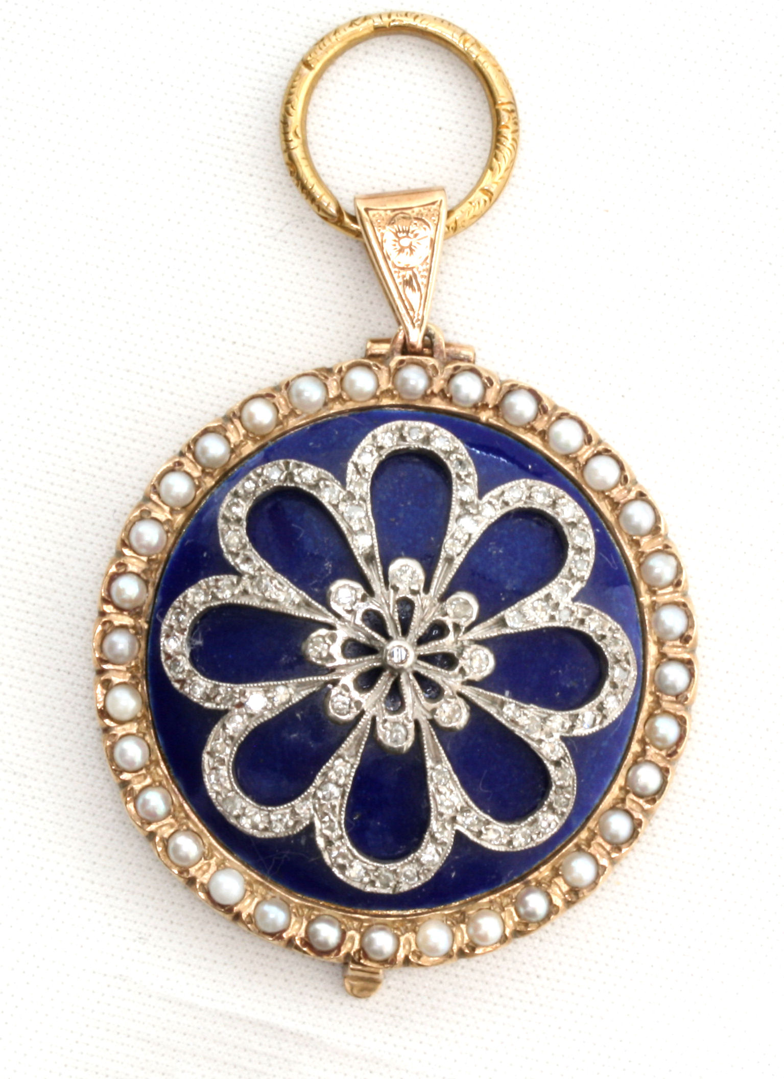of circular form, the domed centre with blue enamel ground, onset diamond set lobed motif and all within a pearl set border, engraved swivel bale, engraved edge, hinged rear cover enclosing a glass panel