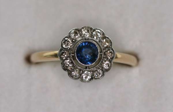millegrain collet set to the centre with a circular cut sapphire, within a shaped circular border of twelve old European cut diamonds