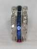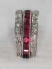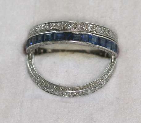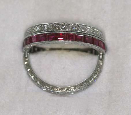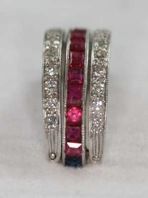 millegrain channel set to one side with calibre cut rubies and to the other side with similarly cut sapphires, flanked above and below by hinged borders, millegrain set with single cut diamonds, with scroll decorated sides