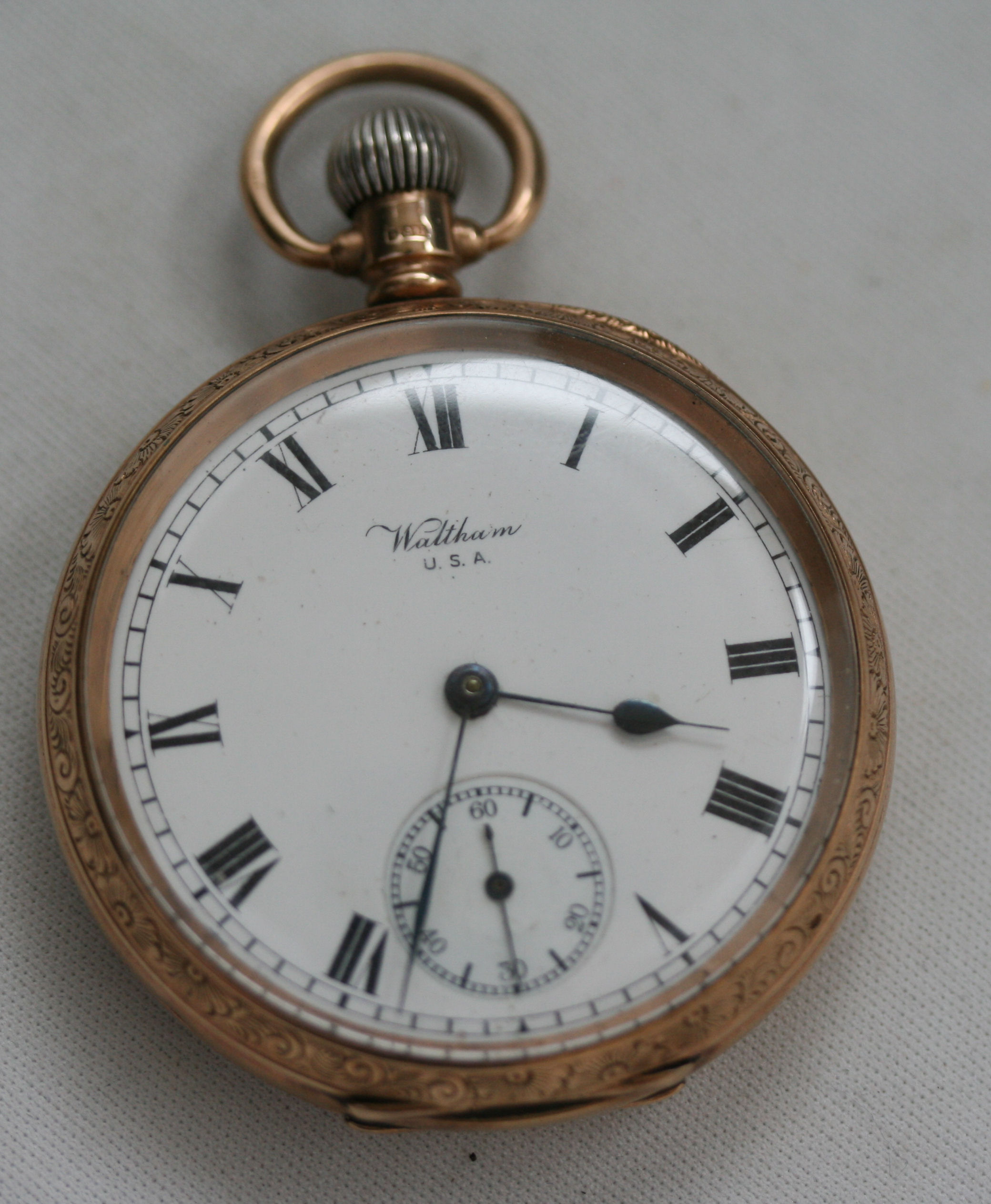 the open faced keyless wind watch with white dial, plain case with chased decorated borders