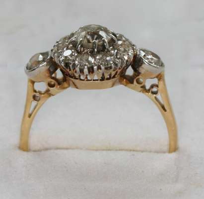 claw set to the centre with an old European cut diamond, within a circular border of smaller similarly cut diamonds, additionally flanked to either shoulder by a millegrain collet set old mine cut diamond, shank stamped 18ct