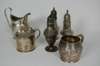 to include a drum mustard pot, London 1800; a helmet form cream jug with engraved decoration, London, date letter lacking; a small baluster mug with reeded and floral borders, Newcastle 1791; a later decorated matched pair of baluster pepperettes with indistinct London marks and a Birmingham 1893 pepperette (6)
