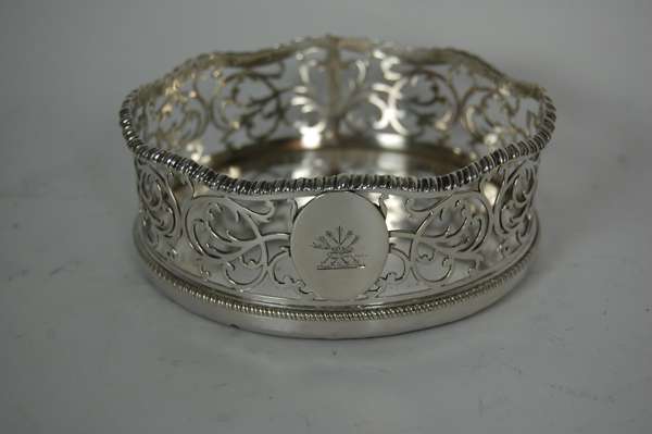 Erick Romer, London 1759, of circular outline with scalloped gadrooned rim above pierced foliate scrolling gallery, with later applied oval cartouche, the centre silver liner with additional makers mark