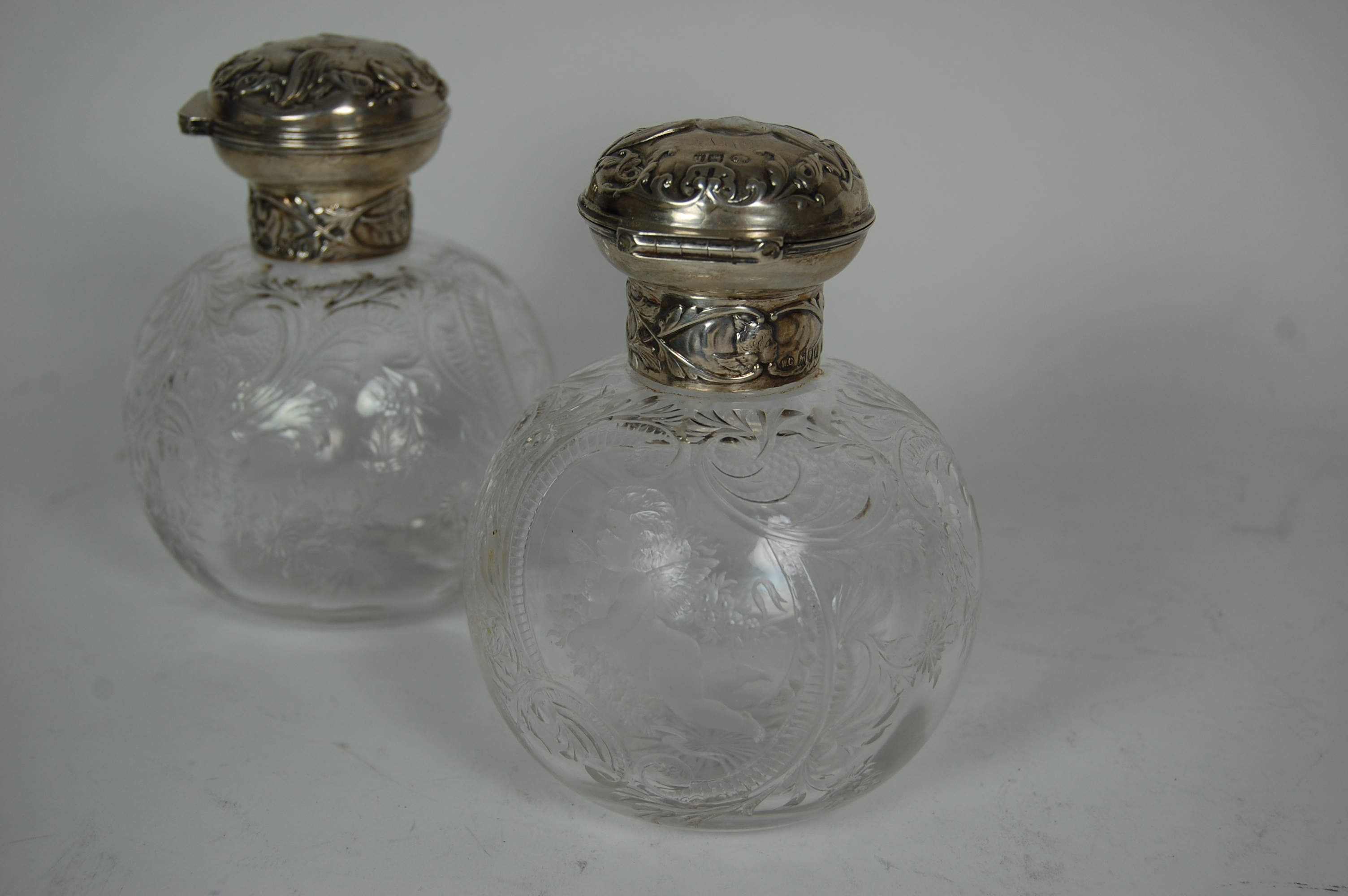 W Comyns, London 1901, the bulbous cut glass bodies with fine scrolling and pendant swag decoration with cartouche of putti, the hinged silver covers embossed with winged masks and scroll borders (2)