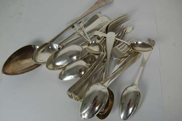 to include; a serving spoon London 1818; a set of six dessert forks G Adam, London 1856; a set of six dessert spoons, A Henderson, Edinburgh 1816; a set of six teaspoons Hester Bateman London 1785; a set of six pointed end dessert spoons, A Spence Edinburgh (marks worn), (qty)