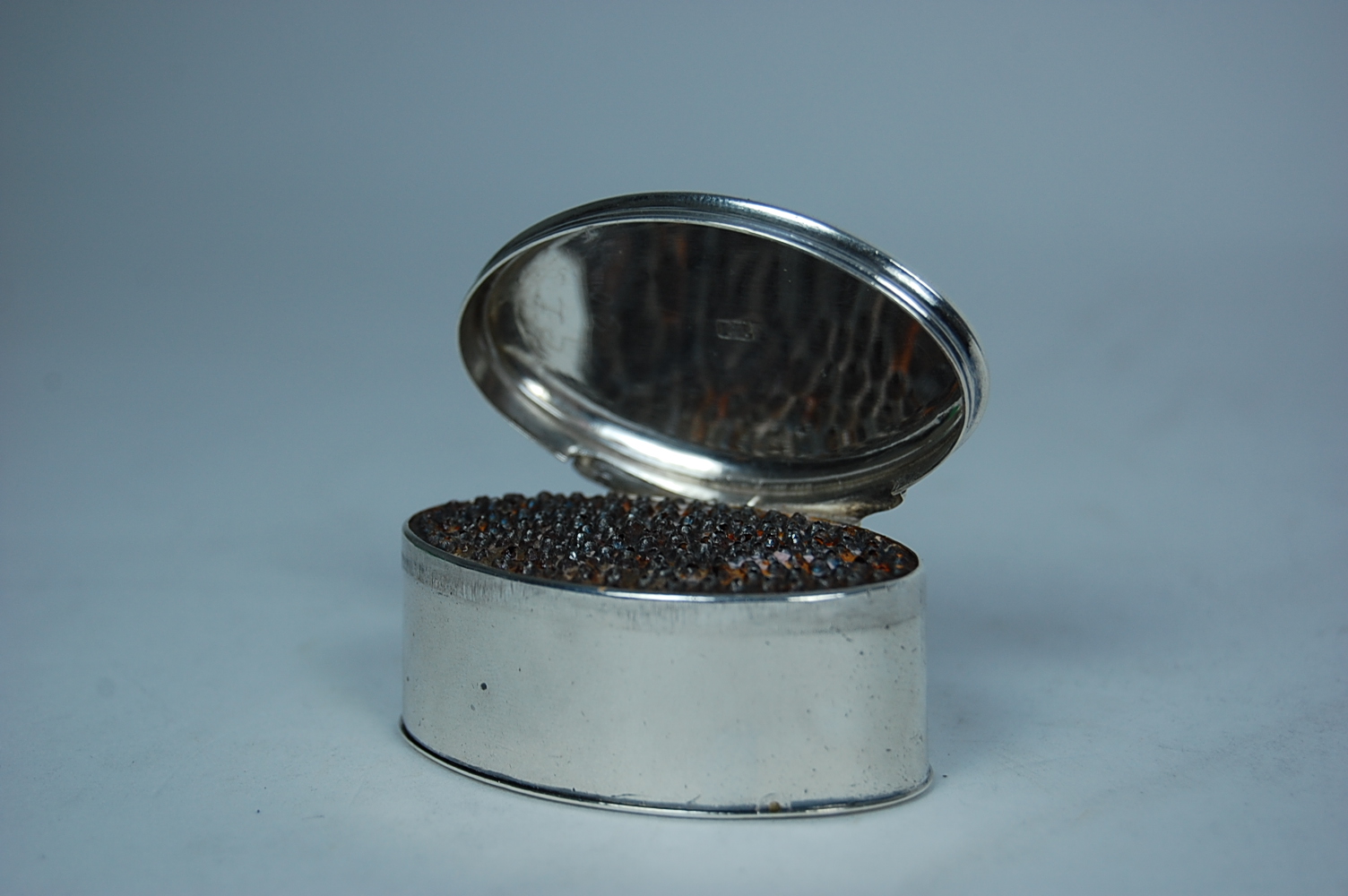 J Phipps, circa 1800, makers mark only, the navette shaped box with slightly domed hinged cover with reeded border, the base with flush hinged compartment with engraved border