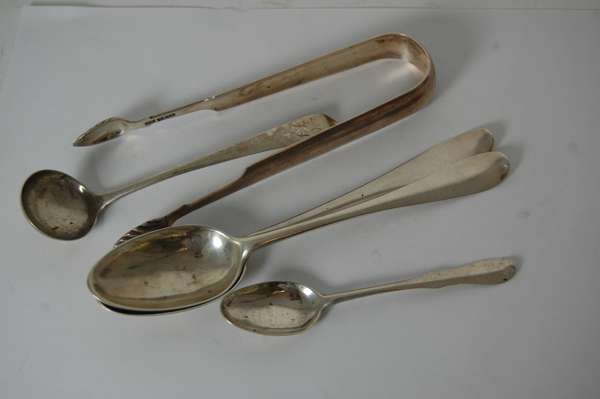 to include, a Scottish Fiddle pattern A Forbes of Aberdeen (possibly), makers mark thrice; a pair of desert spoons, Inverness T Borthwick, marked TB, camel, INS; an unusual small ladle Benjamin Lumsden Montrose, marked BL,flowerhead; a pair of sugar tongs with shell bowl, Robert Keay fo Perth RK, eagle, RK (5)