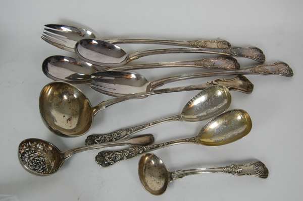 London 1854, single struck and with vacant terminal; a pair of fruit spoons, of hunting pattern, double struck with urn decoration to reverse and mask detail at heel, London1874; together with a Victorian Queen's pattern toddy ladle, a continental sifter spoon and two pair of silver plated salad servers (9)