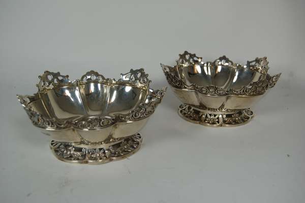 London 1899, of lobed form with cast scroll borders, raised on pierced floral foot (2)