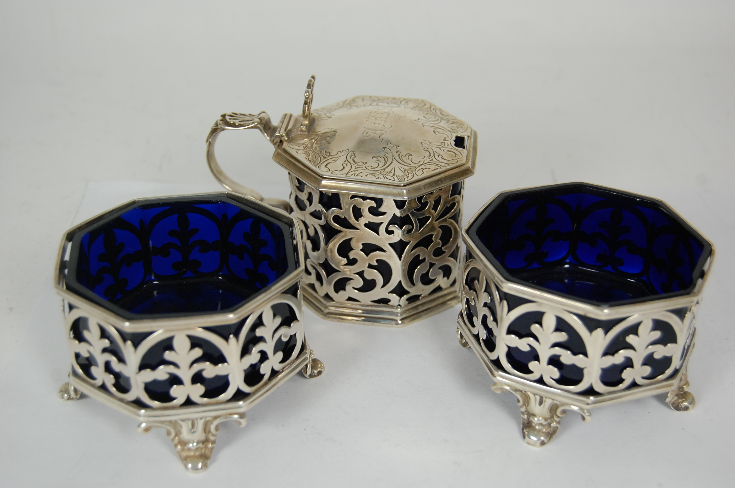 comprising; pair of open salts London 1843, and a drum mustard London 1846, each of panelled form with pierced scrolling panels and reeded rims, the mustard with hinged slightly domed cover (3)
