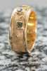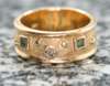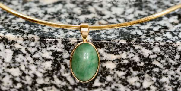 the ring designed as a broad band with textured finish, collet set to the front with an old European cut diamond flanked to either side by a trap cut emerald, stamped indistinctly; the pendant collet set with an oval cut green cabochon, with plain bale stamped indistinctly, suspended from a fancy flat link necklace, with plain rectangular clasp stamped 750 ITALY (2)