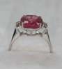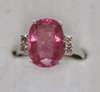 claw set with a large oval cut pink tourmaline, flanked to either side by two round brilliant cut diamonds