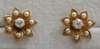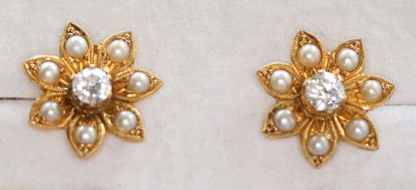 each claw set to the centre with a round brilliant cut diamond, within a millegrained petal shaped surround set with seven half-pearls (untested, likely to be cultured), with post fittings