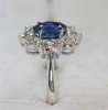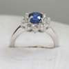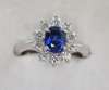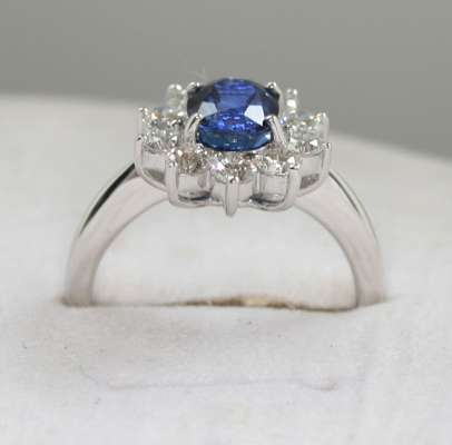 claw set to the centre with an oval cut sapphire, within a surround of ten round brilliant cut diamonds, precious white metal setting stamped 750