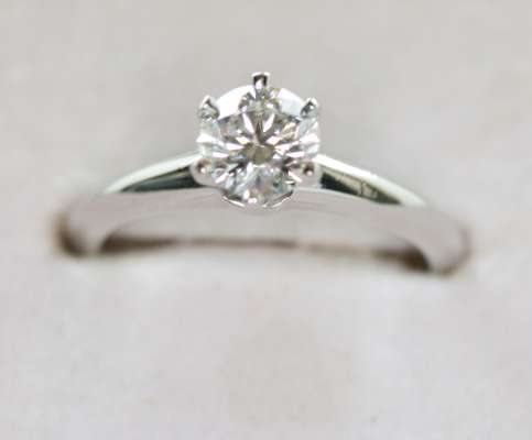 claw set with a round brilliant cut diamond, shank stamped (C) TIFFANY & CO., PT 950, 22005413 .72CT, with original boxes and accompanying certificate numbered 22005413/H05130153, stating carat weight 0.72cts, colour grade H, clarity grade VS1