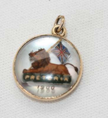 the circular intaglio depicting a resting lion holding a Union Jack flag above a banner inscribed PRETORIA 1900, with plain closed back setting and suspension ring