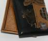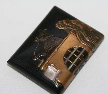 Meiji period, of rectangular form, the cover with gilt lacquer detail of an oxen at a byre with a mother of pearl onlaind pail to the front, the interior with hiramaki-e ground
