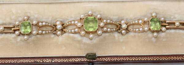 An Edwardian 15ct gold peridot and seed pearl set bracelet,