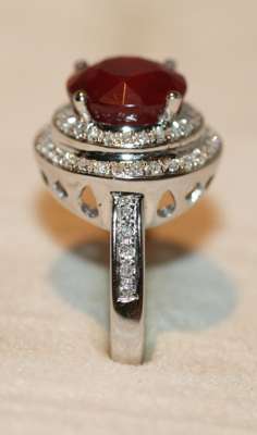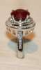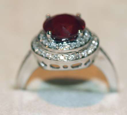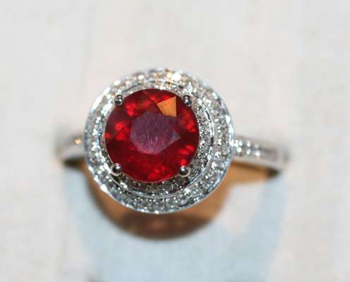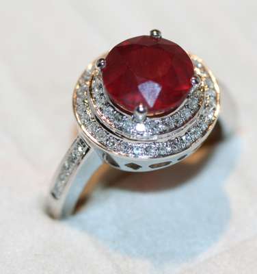 the central ruby of strong deep red colour (likely to have been treated with a filler) within two stepped circular borders claw set with single cut diamonds, additionally set to each shoulder with five graduated similarly cut diamonds