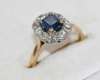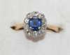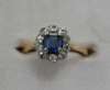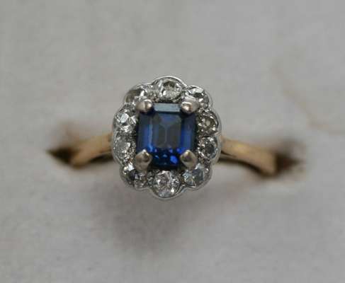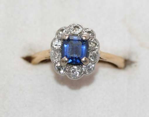 the shank stamped 18ct, the central square cut sapphire surrounded by a border of old cut diamonds, in pierced mount