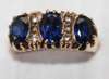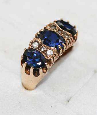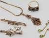 the collet set seed pearl studs suspending a knife bar drop with pear shaped peridot; together with two pearl set bar brooches a synthetic sapphire three stone rim and pendant and chain etc (qty)