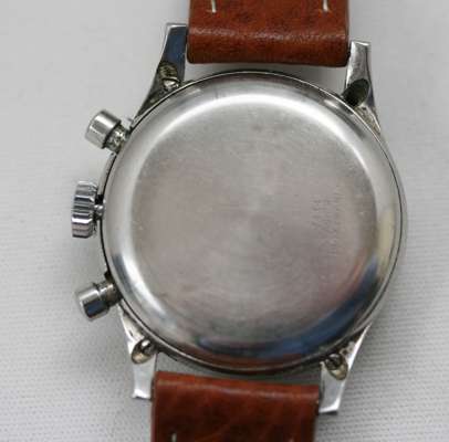 Dial Signed Aristo 17 jewels, Incabloc antimagnetic and Swiss Below the 6. Thirty Minute Register at 3:00, and constant Seconds, centre flyback hand and perimeter red/blue Telemeter/Tachymeter graduations, stainless steel case, leather strap, numbered to the rear 7434