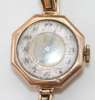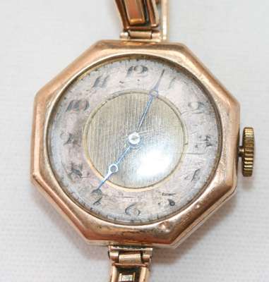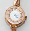 the first 9ct gold, circular white enamel dial, the Arabic numerals in blue enamel on a pink enamel bezel, sprung gold bracelet; the second with a silvered circular dial within an octagonal bezel, sprung gold bracelet (2)