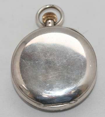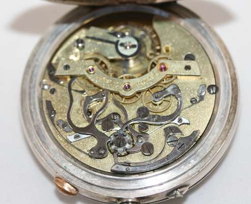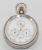the frosted gilt movement inscribed S Smith & Son London 9 The Strand, with bimetallic balance, lever escapement jewelled to the centre, the chronograph mechanism on the backplate operated by the crown and a second gilt button in the band, the white enamel dial with eccentric Roman chapter ring, subsidiary dials for running seconds and elapsed minutes, outer seconds ring with two sweep centre seconds in plain silver case, the dial signed and numbered - 141-187