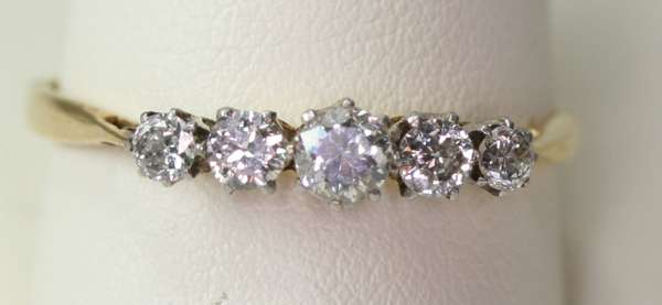 the graduated European cut diamonds claw set in a pierced scrolling gallery; together with another diamond five-stone ring, claw set with circular cut stones in platinum, yellow gold shank (2)