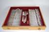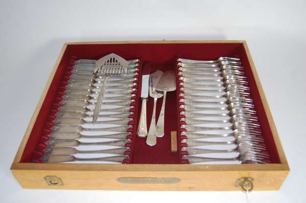 marked 800, of simple outline with linear border with urn and scroll terminals; comprising various teaspoons, ladle, serving spoons, dessert forks, dessert spoons, table forks and table spoons; together with fish knives and forks, table knives etc, contained in a fitted six drawer oak canteen with simple pull out drawers and brass ring handles (qty)