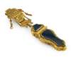unmarked, the hinged clip with scroll formed border enclosing fine relief scenes of classical figures and lion masks, suspending a gilt etui with bloodstone panels to body and hinged cover, the interior fitted with spoon, fruit knife, scissors, pencil etc