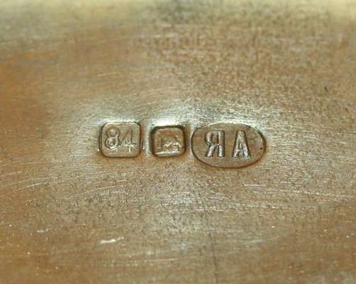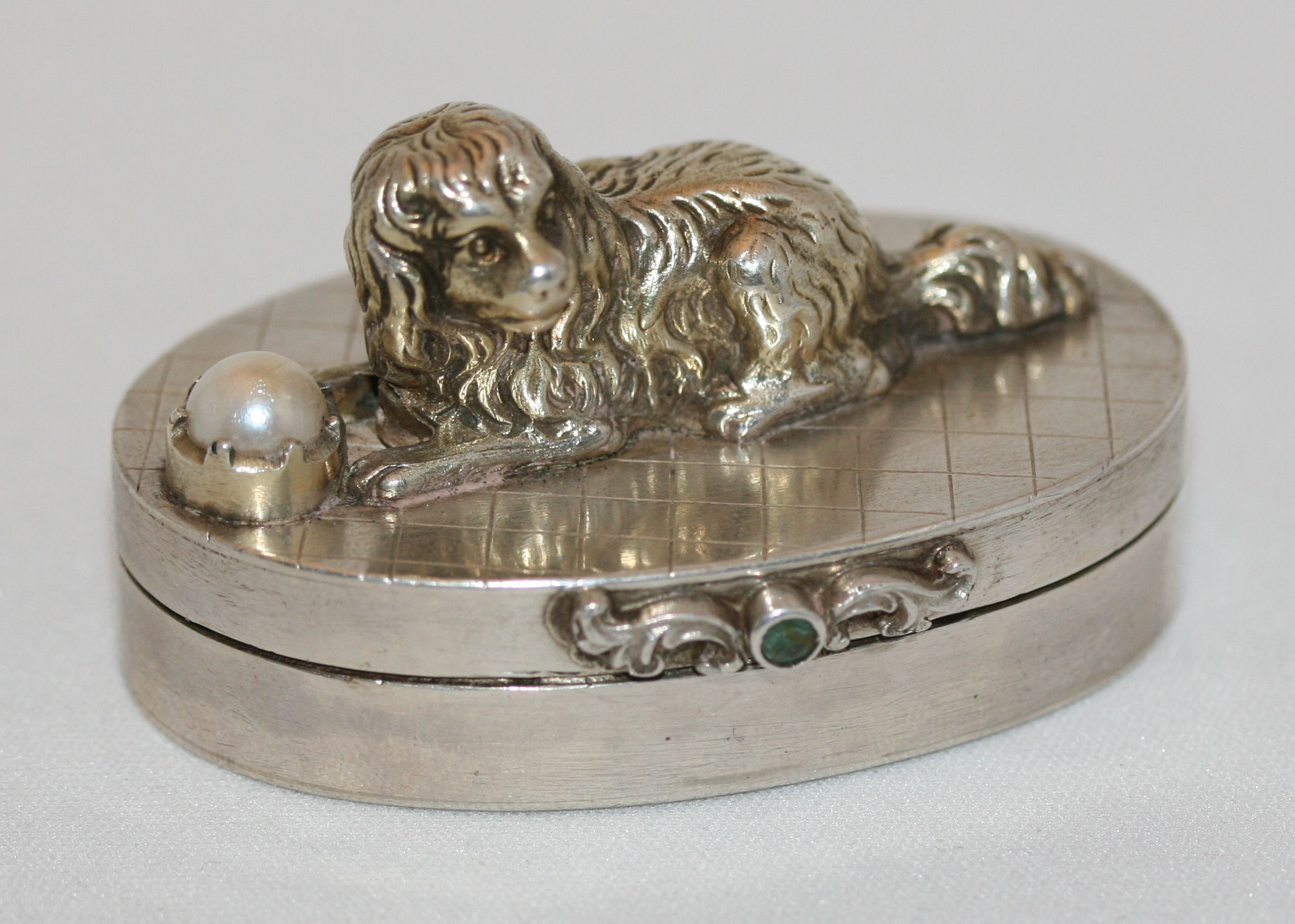 Moscow, modern first half 20th century, maker RA in cyrillic, of oval form the hinged cover with a cast dog with a pearl 'ball'