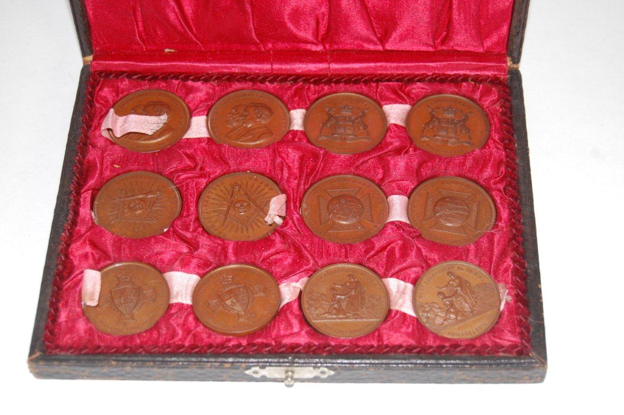 comprising twelve bronze token in original fitted silk lined case, with two example o each design