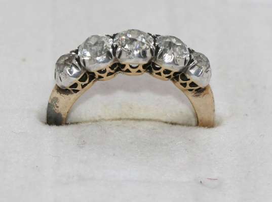 claw set with five graduated old mine cut diamonds, platinum and 18ct gold shank, pierced gallery
